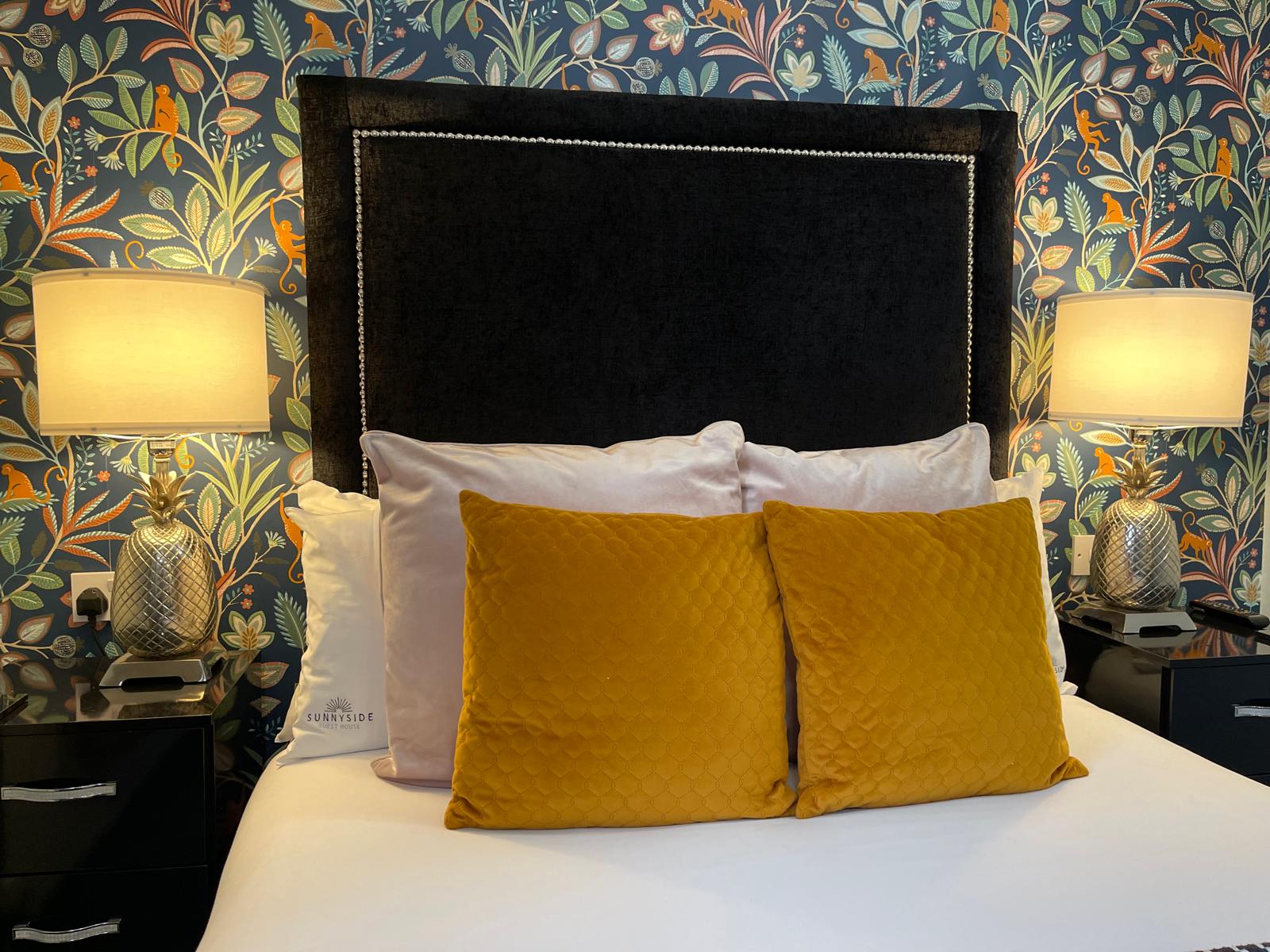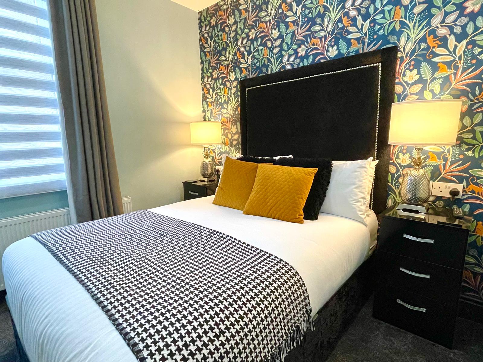 The cosy bedroom has a double bed with a large headboard. Either side of the double bed has bedside tables, lamps, conveniently positioned double sockets and light switches.
